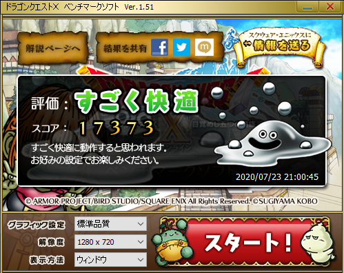 設定は初期状態のままですが、なかなか良いスコアがでました。いつの日かDQ10を再び遊べる日がやってきたら良いなぁ。