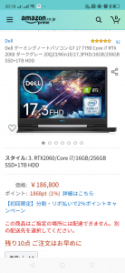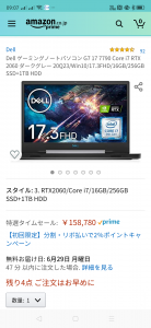DELLアンバサダーなのでDELL製品から購入することとしているが、アンバサダー金額(特価)が出るまで一週間掛かるのが長くて待ちきれずに、Amazon特選タイムセールで「G7 17 7790」を購入した。